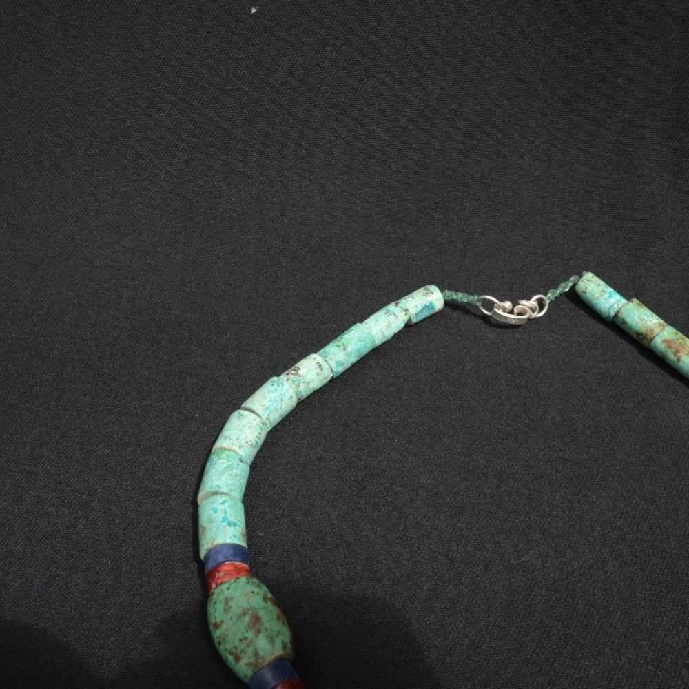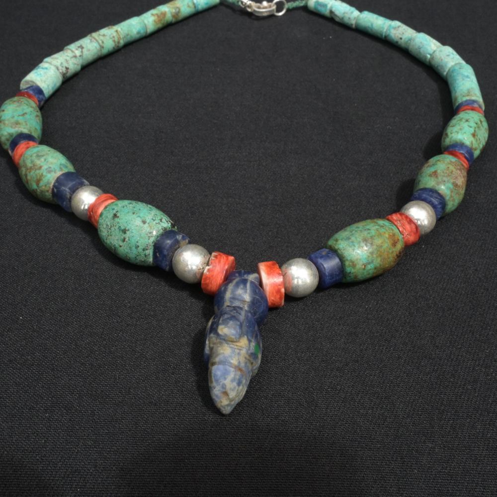 This Chavín necklace combines green turquoise beads with deep blue sodalite and details in reddish and silver tones, achieving a chromatic composition that reflects the sacred duality of the Andean world: earth and sky, life and spirit. At the center stands a carved sodalite pendant, a symbol of connection and ritual strength.