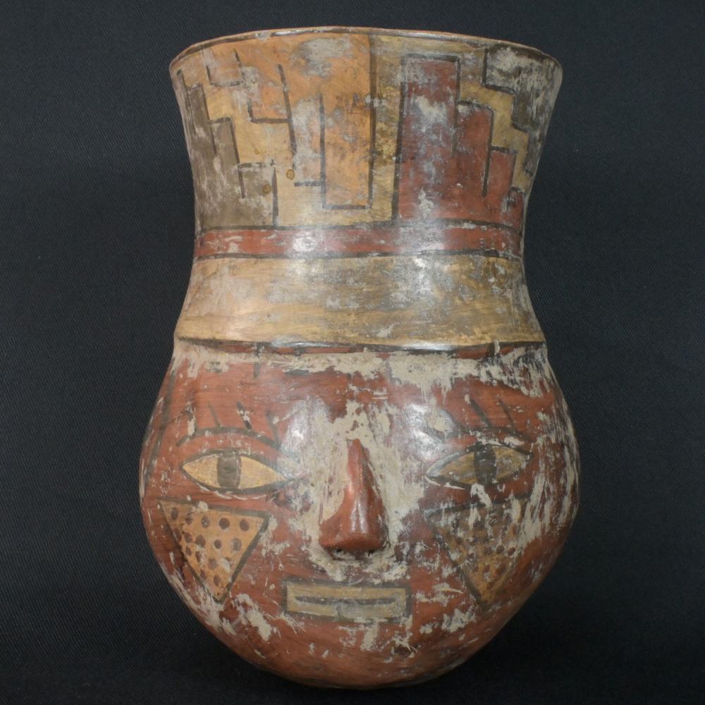 Discover the rich history of the Nazca culture with this exquisite pre-Columbian ceramic vessel. Used in sacred ceremonies and rituals, this vessel was a symbol of respect and high status among the Nazca elite. Its intricate design features a solemn face motif, adorned with a variety of colors including brown, cream, orange, black, gray, and reddish hues, enhanced by natural earth aging.