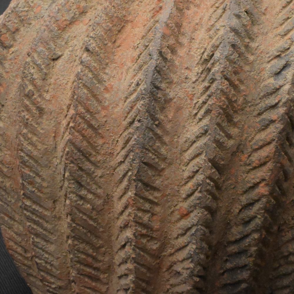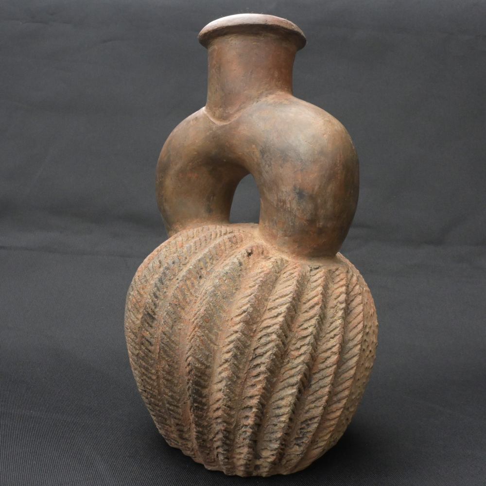 Dive into the mystical world of the Chavin culture with this exquisite pre-Columbian ceramic bottle, a true gem from ancient Peru. Crafted with precision, this artifact resembles a partially peeled fruit, embodying the essence of agricultural rituals and ceremonies.