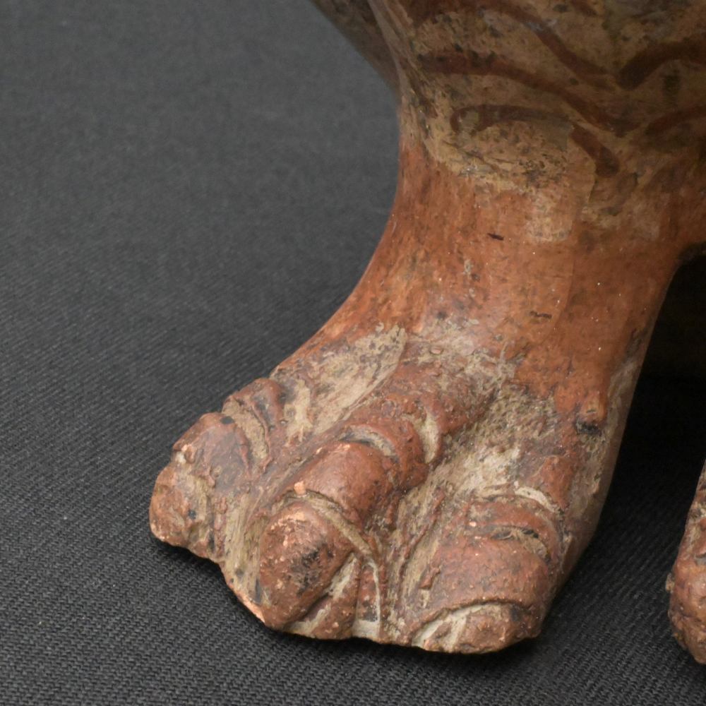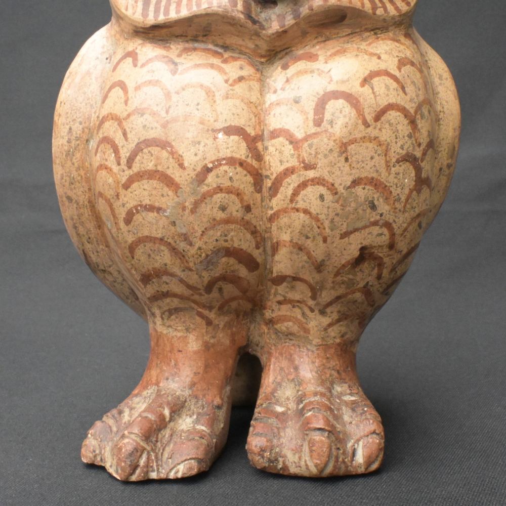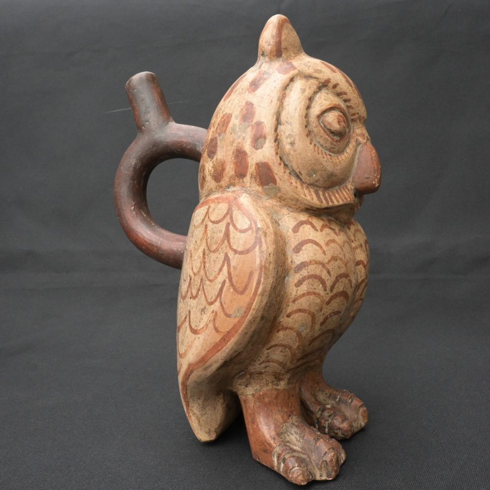 The bottle’s design features a captivating blend of cream and reddish hues, highlighting the intricate patterns of feathers, the beak, and the stirrup handle. Standing at a height of 9.06 inches, with a width of 5.28 inches and a depth of 6.97 inches, this artifact is both a testament to ancient artistry and a conversation starter in any collection.