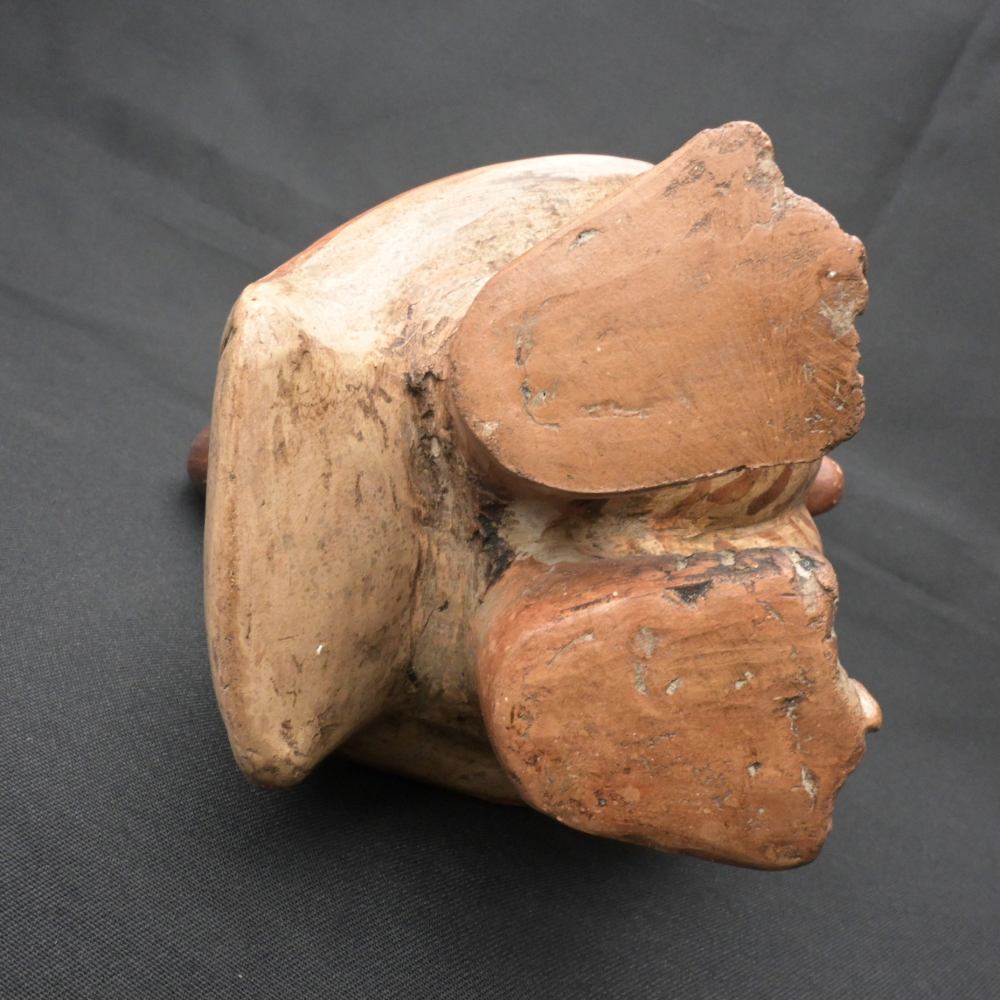 Discover the enchanting allure of the Moche culture with this exquisite ceramic owl bottle. This piece, characterized by its detailed craftsmanship, captures the essence of a nocturnal hunter, revered for its keen vision in the dark.