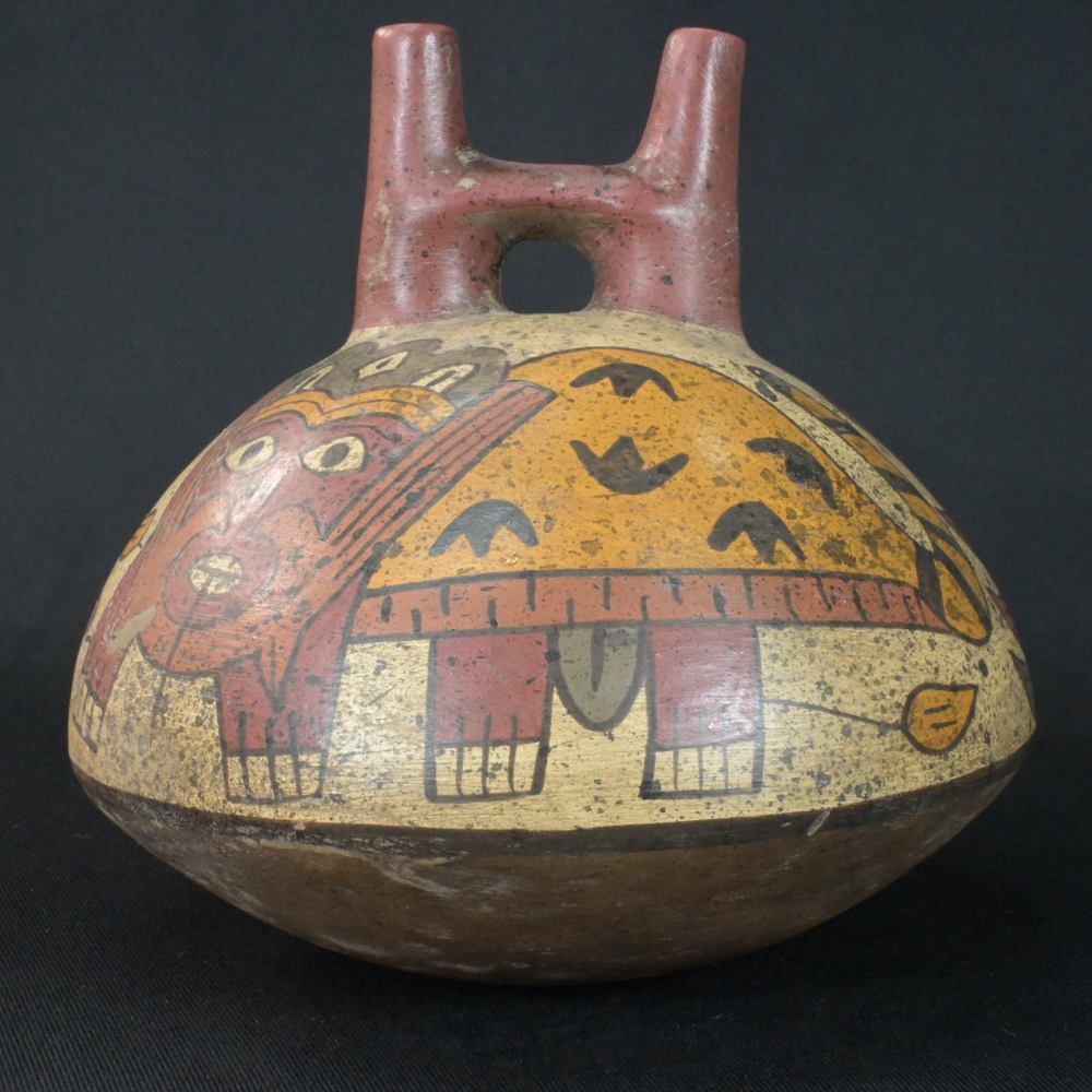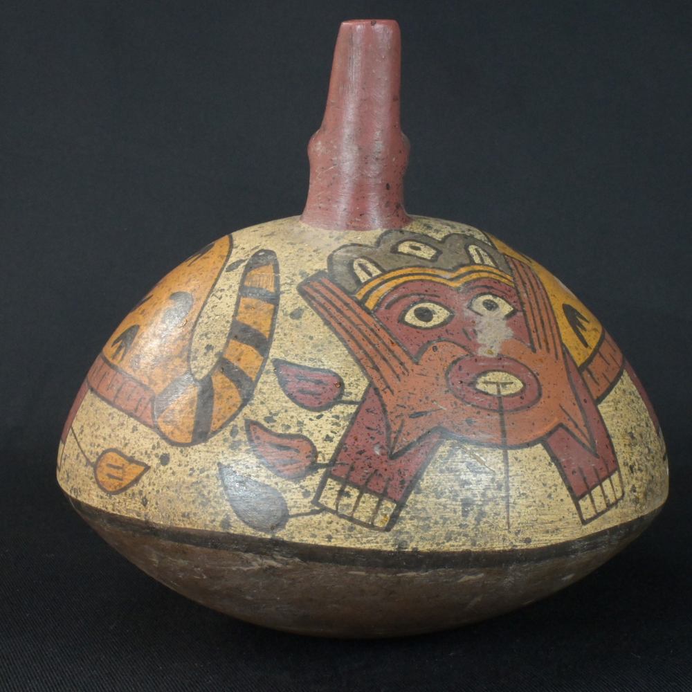Discover the allure of ancient Peru with this exquisite Pre-Columbian Nazca ceramic bottle. Once a vital piece in ritual ceremonies, this artifact is adorned with intricate painted figures resembling insects, highlighting the Nazca culture’s reverence for sacred animals.