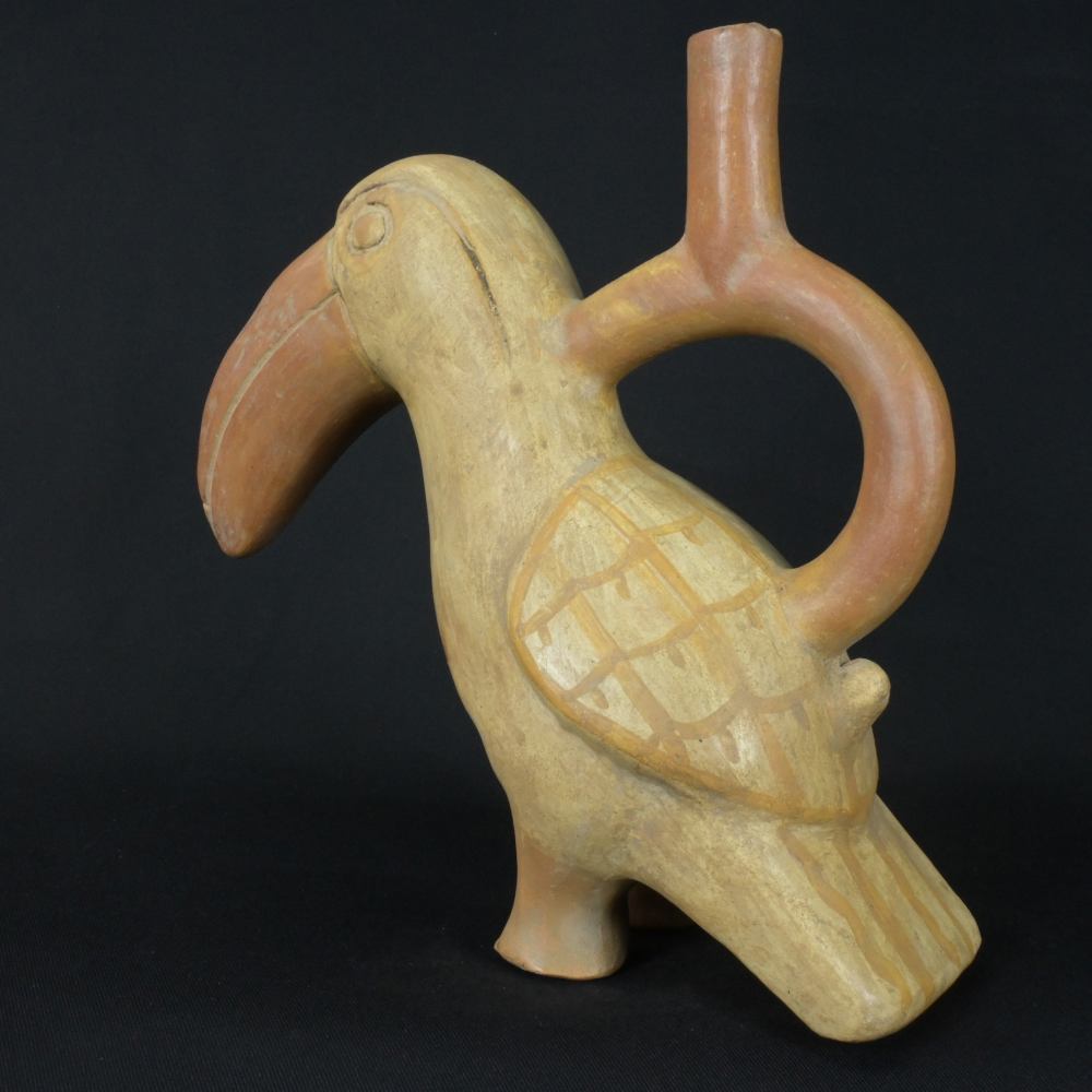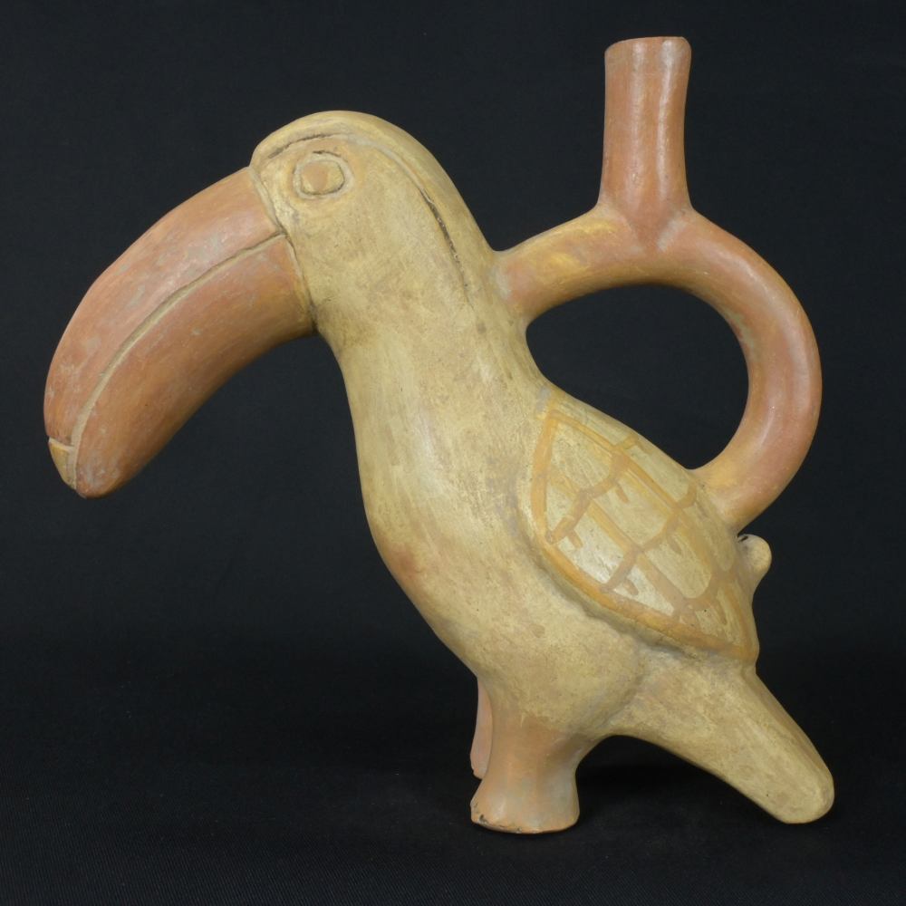 Discover the exquisite artistry of ancient Peru with this Moche ceramic bottle, beautifully crafted in the shape of a toucan. This piece is a stunning representation of Moche ingenuity, featuring a warm palette of cream, orange, and yellow hues.