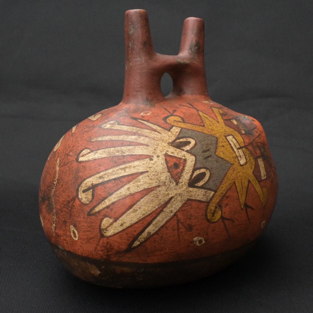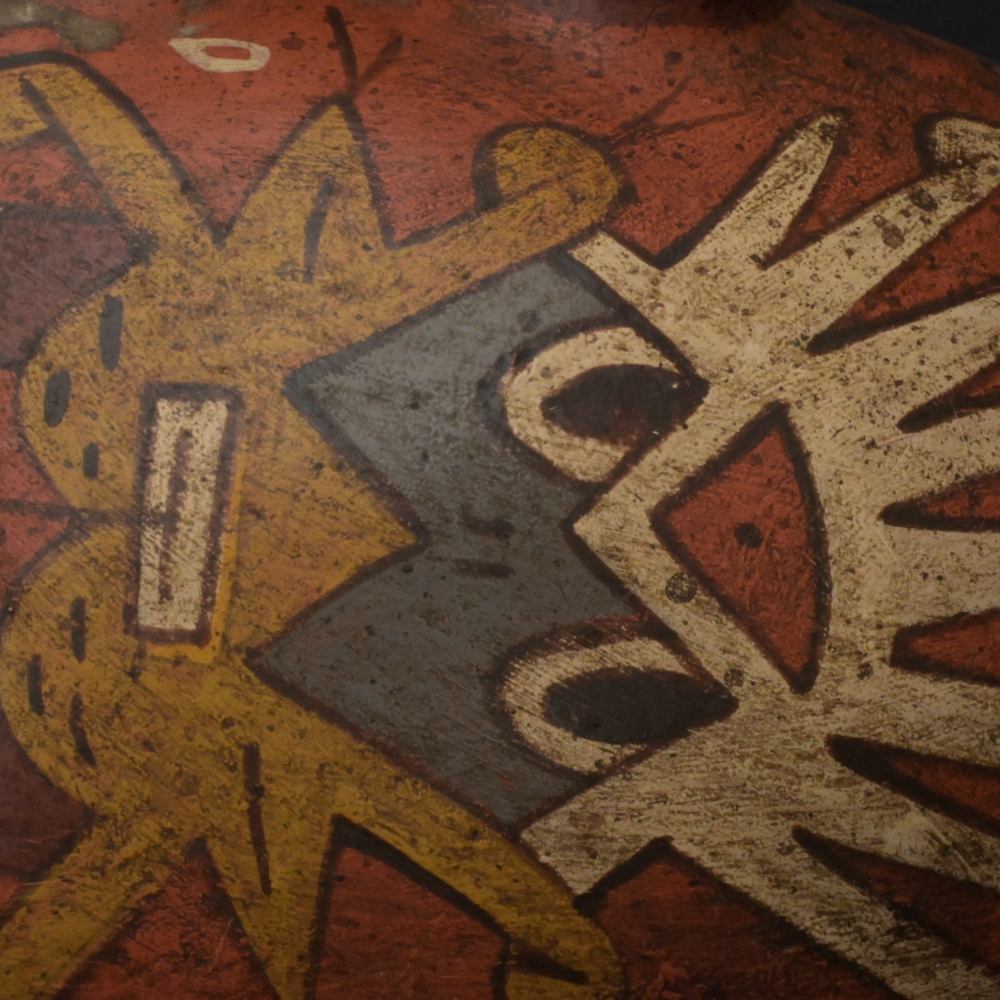 The bottle’s design, featuring vibrant hues of orange, yellow, white, reddish, black, and gray, is a testament to the artistic mastery of Nasca artisans. Its rounded form may represent a significant creature in Nasca mythology, adding a layer of mystique and cultural depth.
