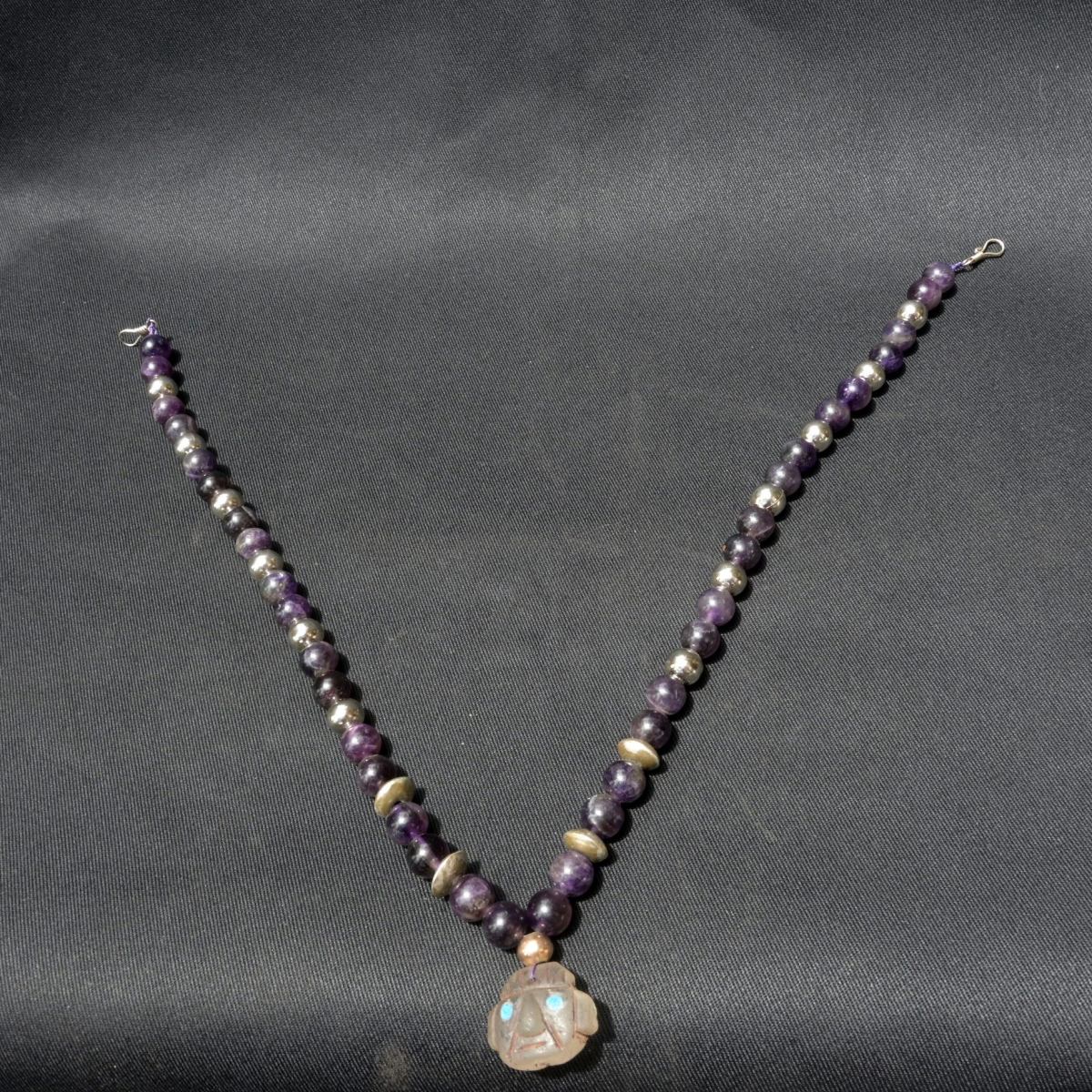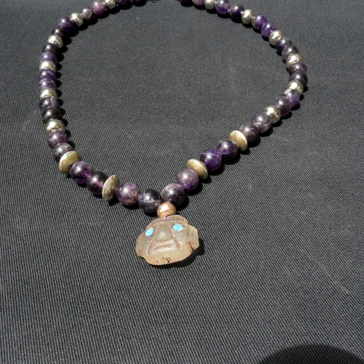 collar de metal y amatista esta figura fue usado en seremonias o rituales por altos mandos de esta enicmatica cultura como saserdotes o el lider de la cultura chavin ademas es perfecta para la decorasion o la colecsion no te lo pierdas