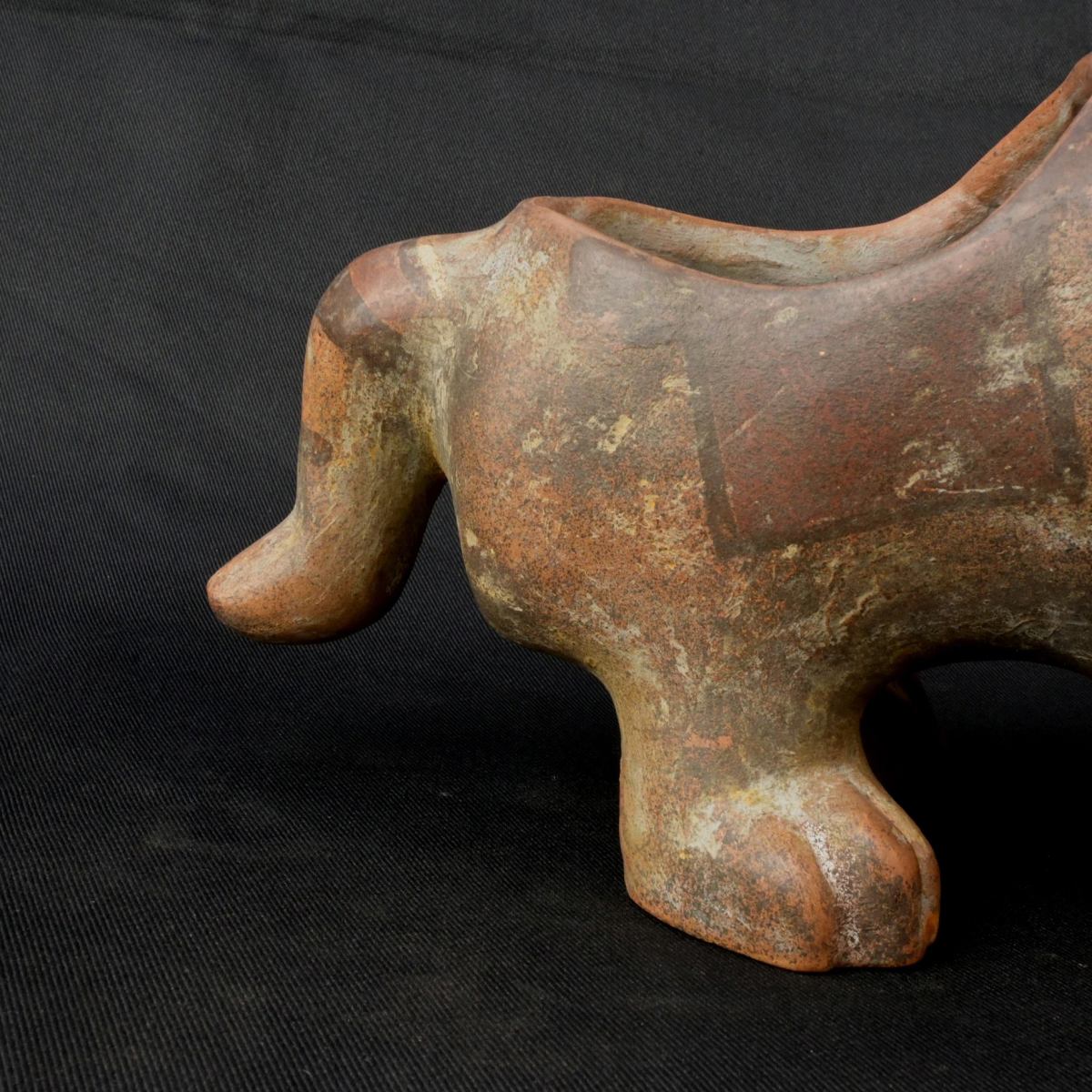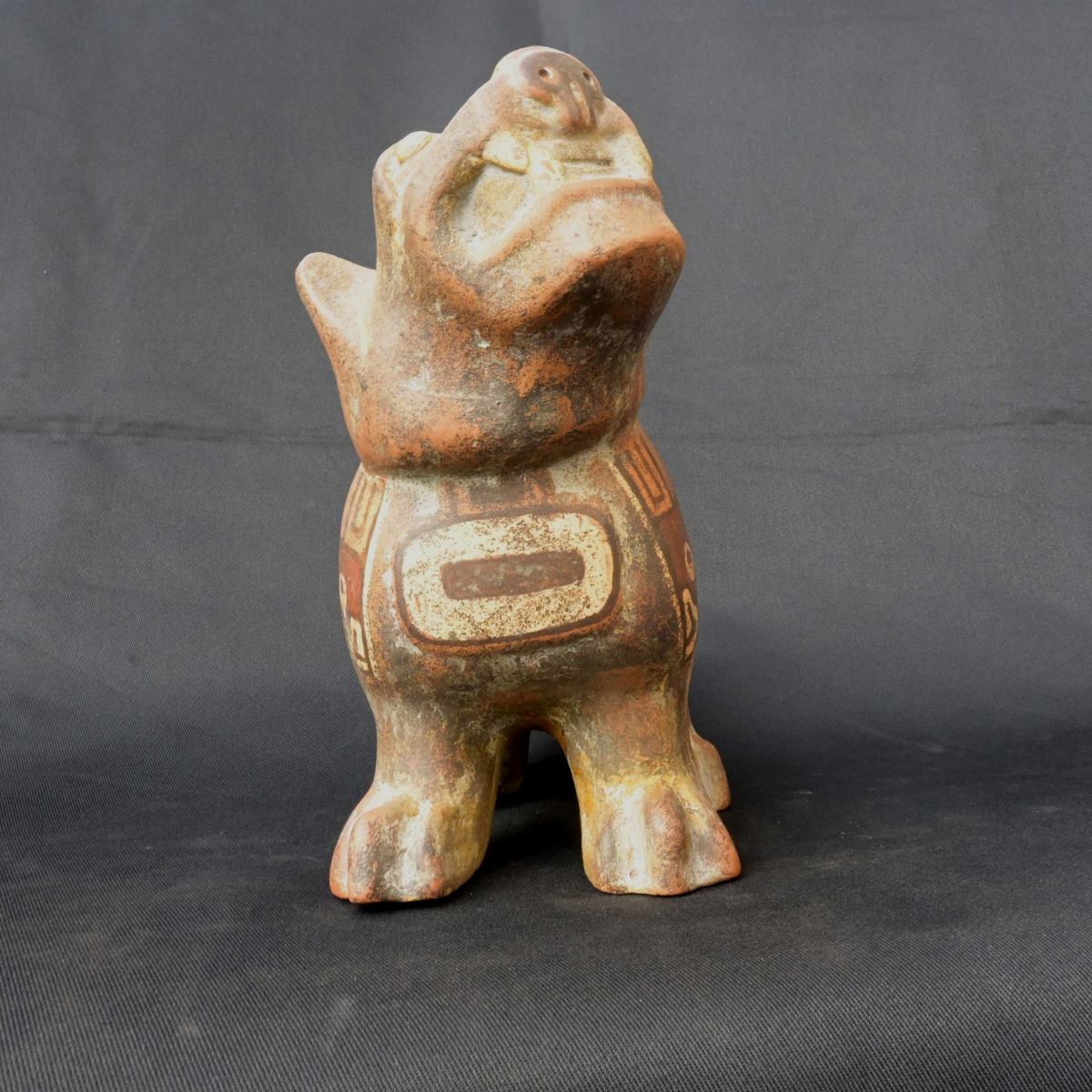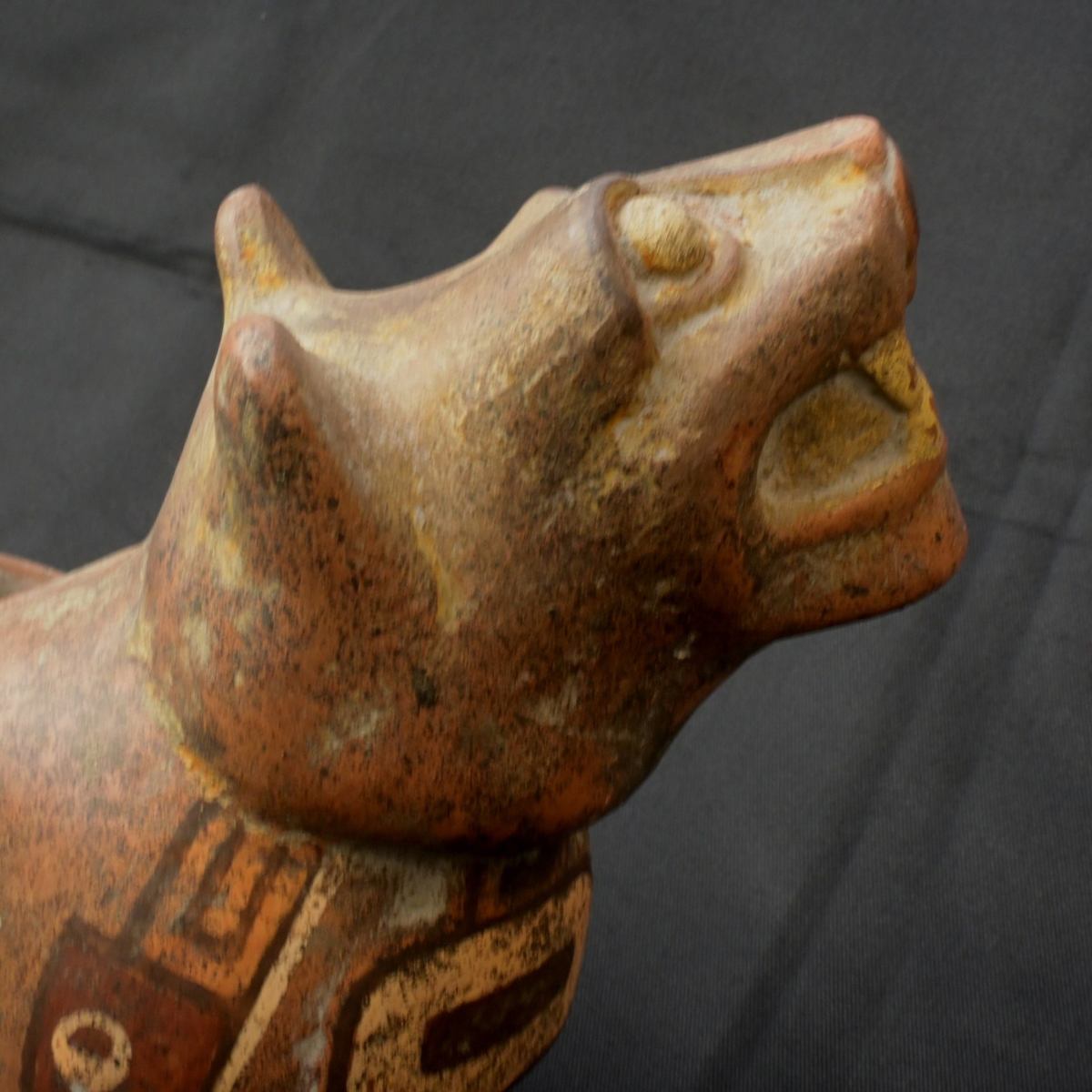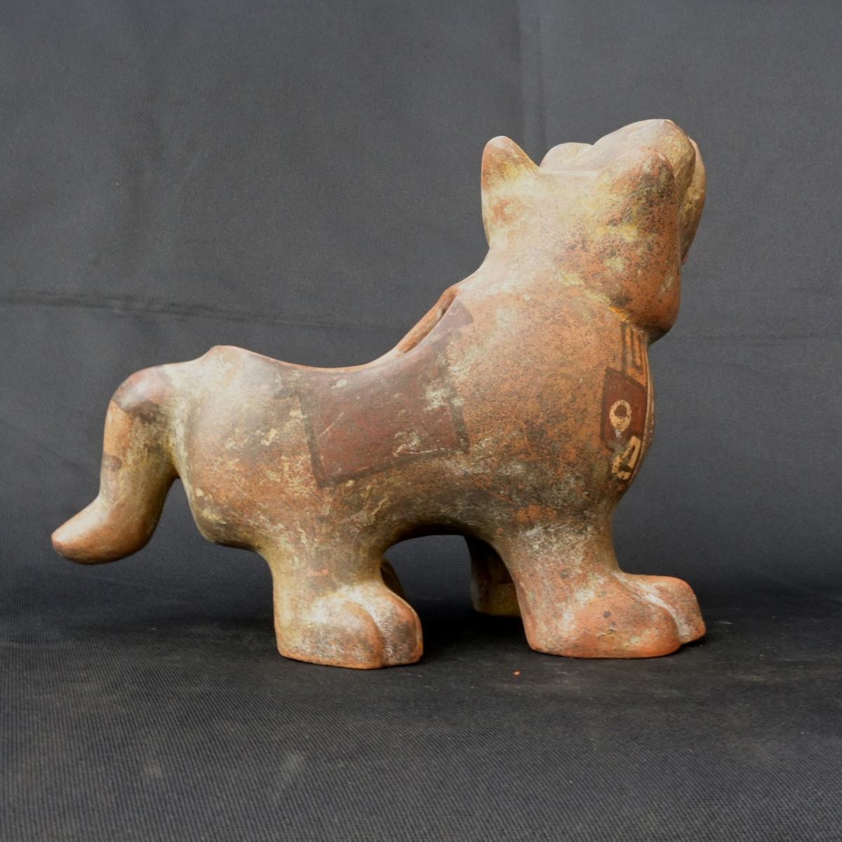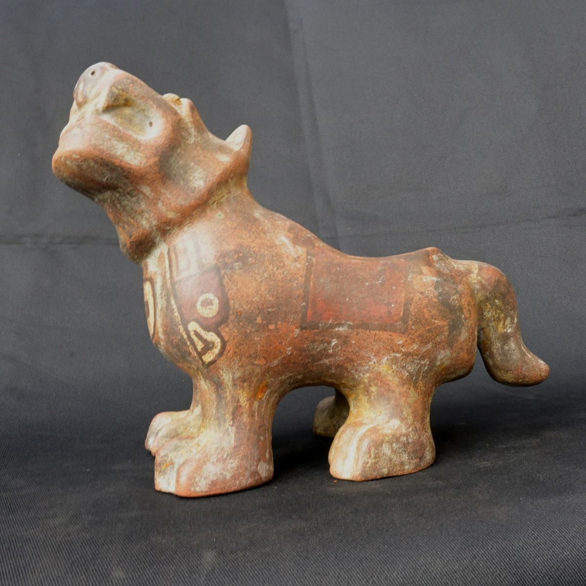 contenedor tiauanaco de seramica con forma de puma este contenedor de seramica cuenta con una forma inponete de un puma que ocserba asia ariba cuenta con detalles de figuras de animales pintadas en el cuerpo con tinte natural de colores como el crema el rojiso el anaranjadoel maron esos son los colores que tiene este contenedor con forma de puma este contenedor fue usado en los ritueles o seremonias de la antuguedad aora es perfecta para la decorasion o la colecsion cuenta con siertos desgarte pero aun es ermoso tener este inponete figura no te lo pierdas