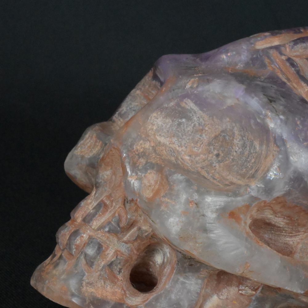 Discover the mystical allure of the Moche culture with this exquisite pre-Columbian amethyst skull. This unique piece features a dual-face design, showcasing a principal visage and a secondary face that emerges when the skull is turned. Such artifacts were believed to embody the spirit or life force in ancient rituals, maintaining the sacred connection between the living and the divine.
