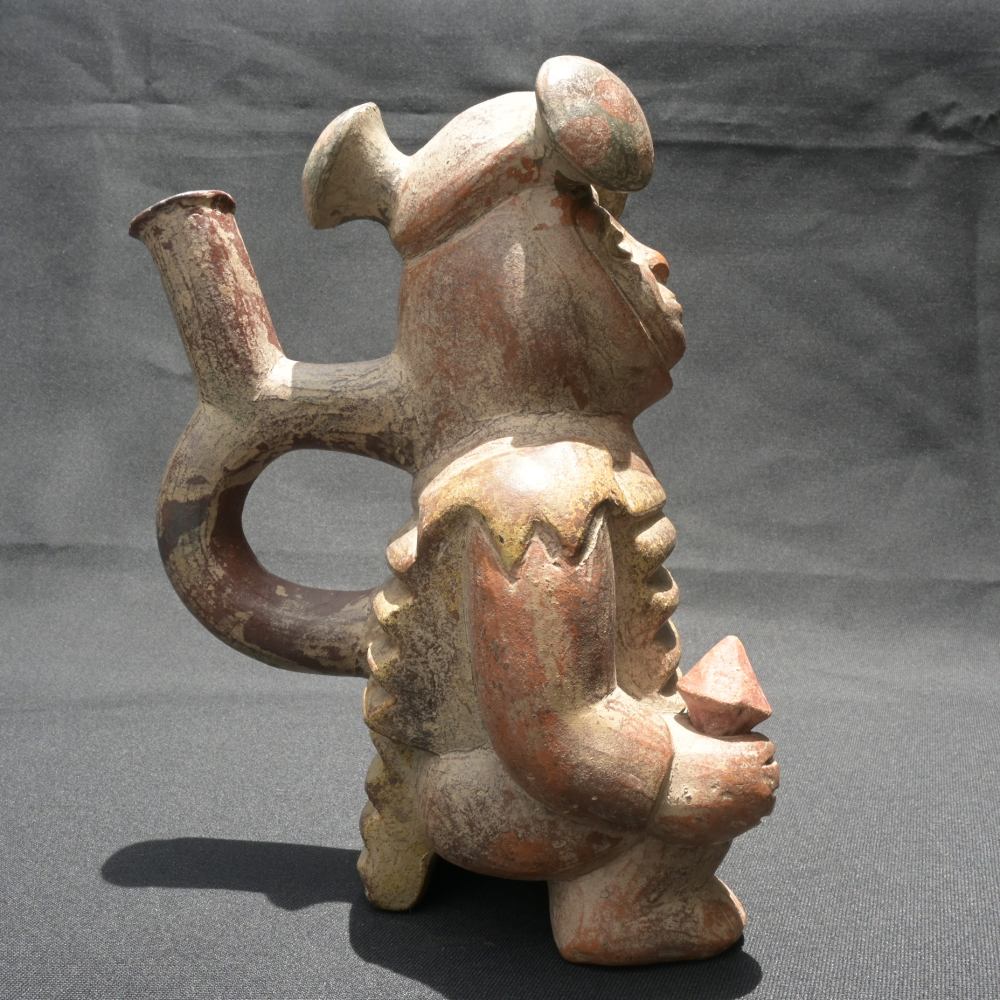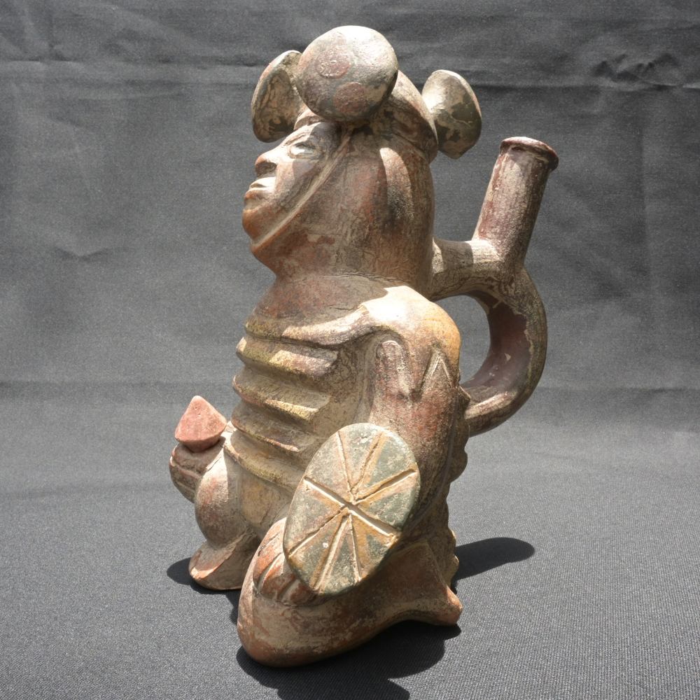 Immerse yourself in the rich history of ancient Peru with this exquisite Moche ceramic bottle, masterfully crafted to depict a warrior in a poised stance. Standing at 8.86 inches in height, with a width of 5.43 inches and a depth of 5.91 inches, this piece is a testament to the valor and strength emblematic of Moche culture.