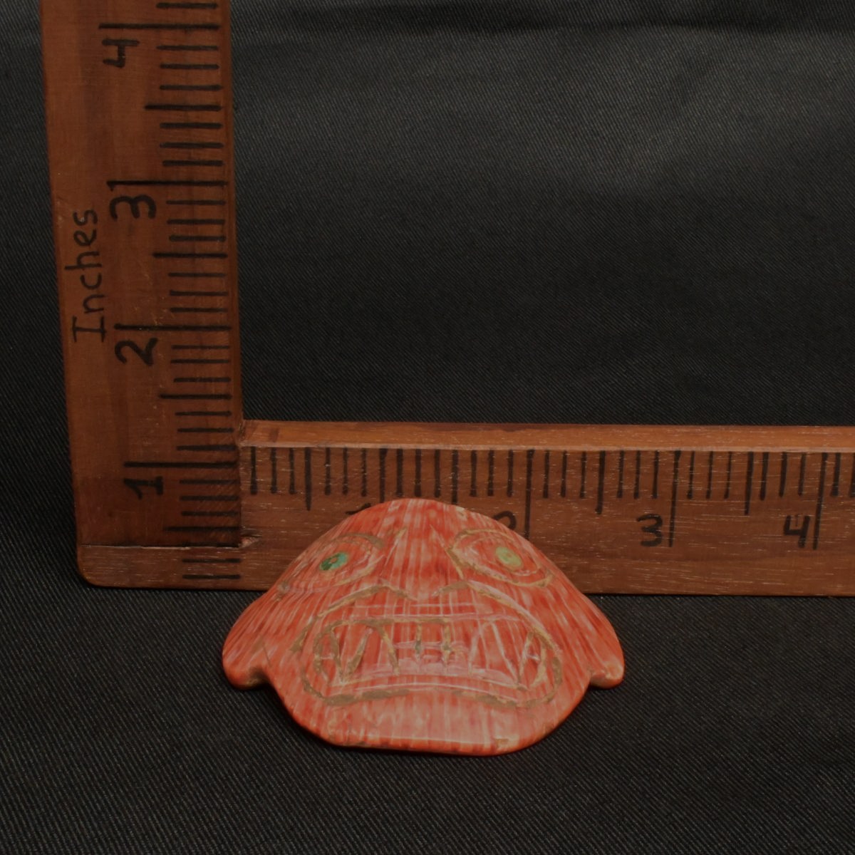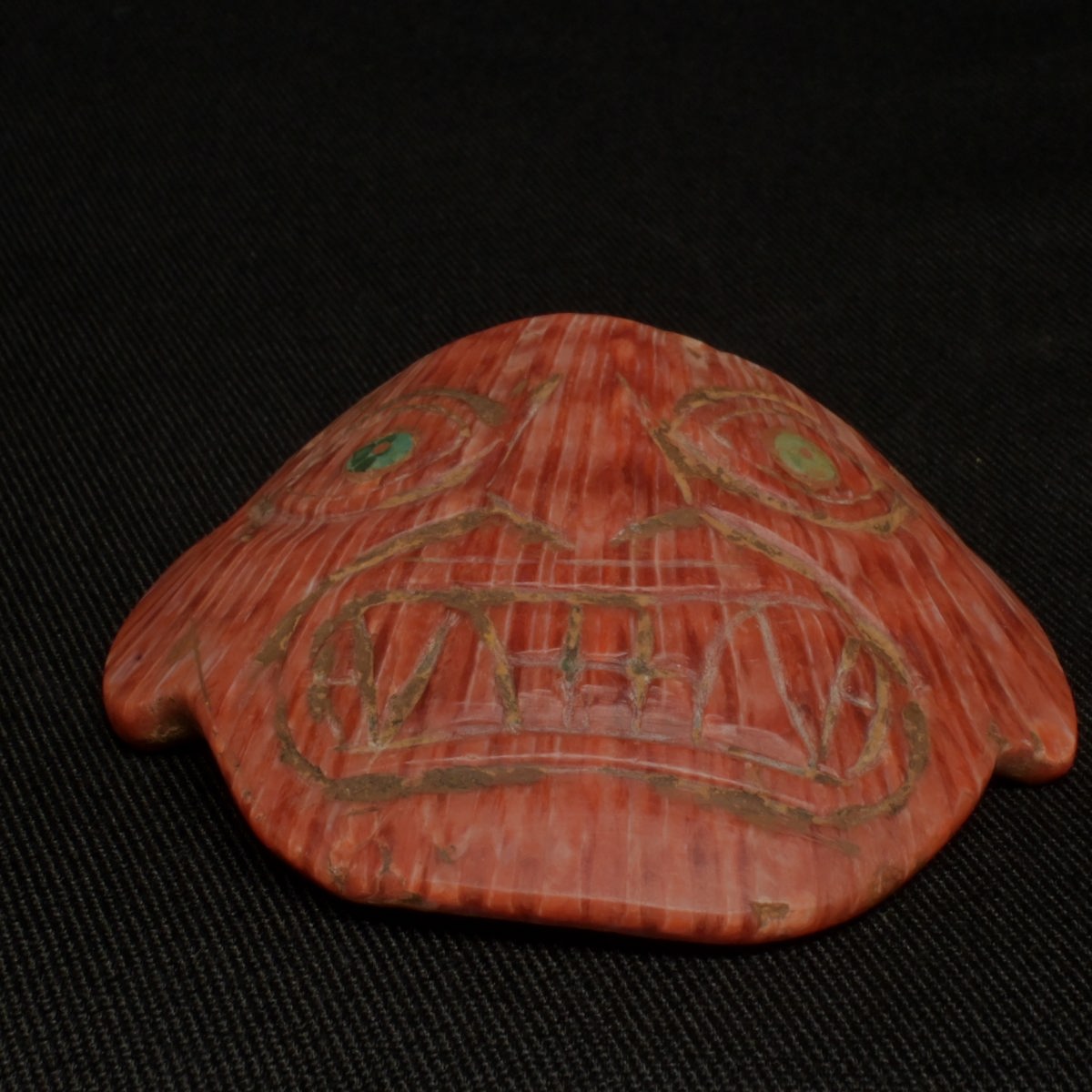 precolonbino de espondilus del mar Moche esta mascara cuenta con barios detalles como sus rostro que tiene unos dientes felinos una naris y ofos enormes con piedra turquesa en el sentro del ojo ademas en los cantos de la parte de ariba cuenta con dos abujeros que son nesesarios para cologar alguna cuarda este espondiloses de color anaranjado fue usado en seremonias y rituales ademas es perfecta para la decorasion o la colecsion no te lo pierdas