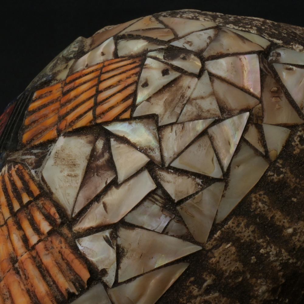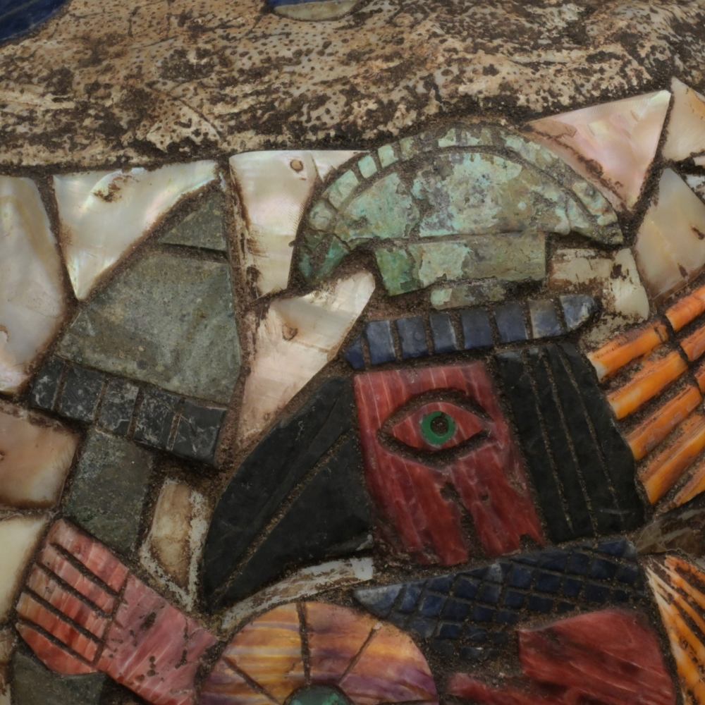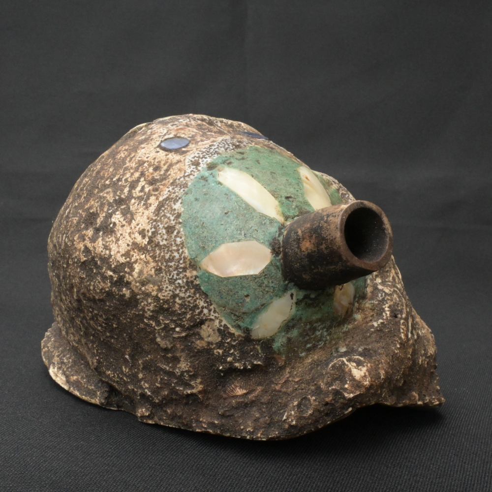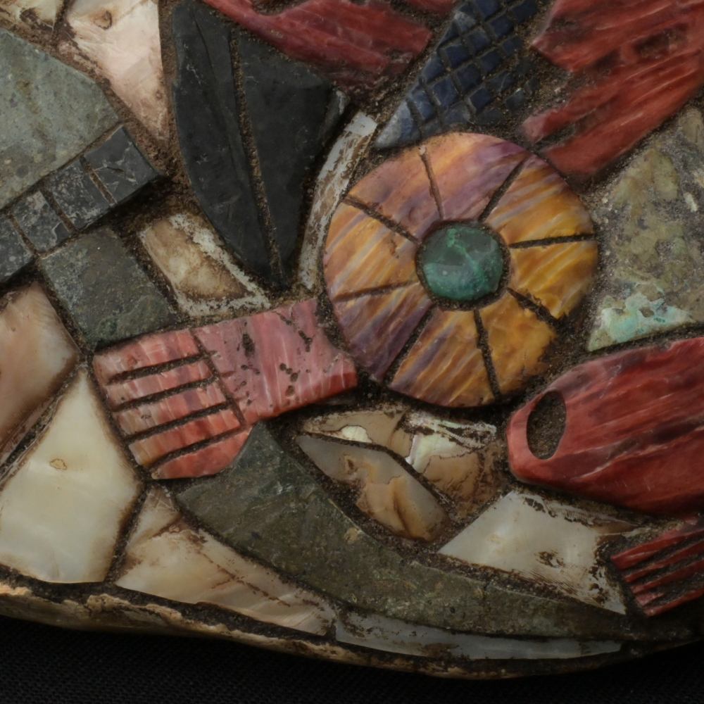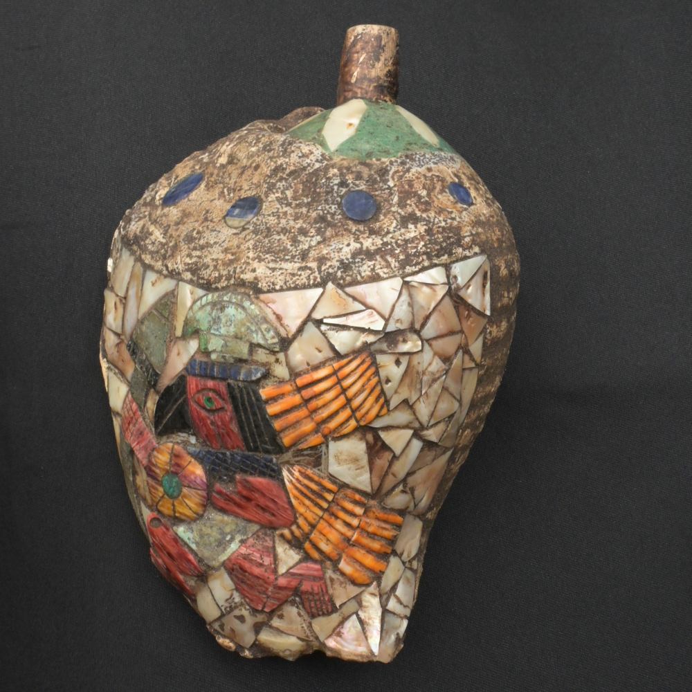 Discover the enchanting sound of the Moche Pututu, a pre-Columbian trumpet used in ancient ceremonies and rituals. This exquisite piece features vibrant gemstone inlays in colors such as yellow, reddish, black, green, blue, and white, adding a stunning visual appeal.