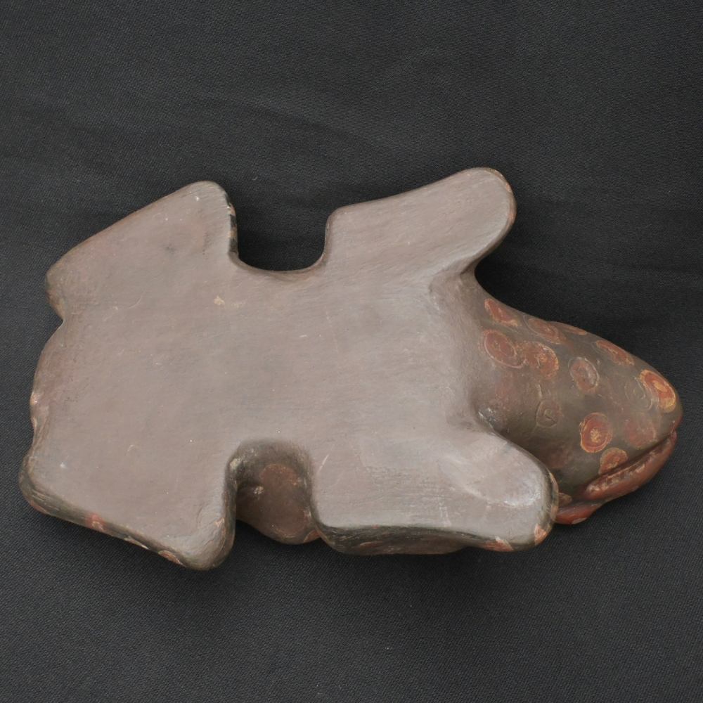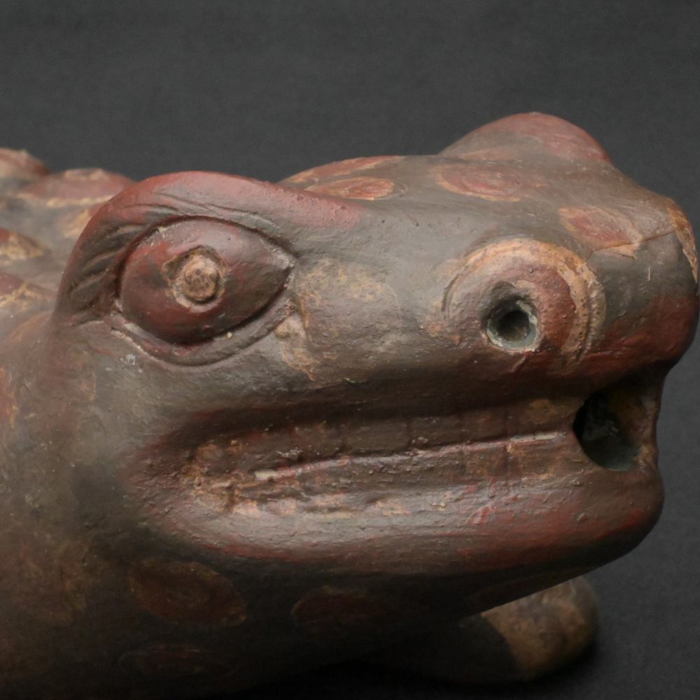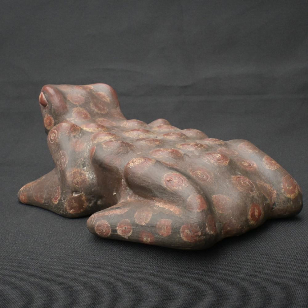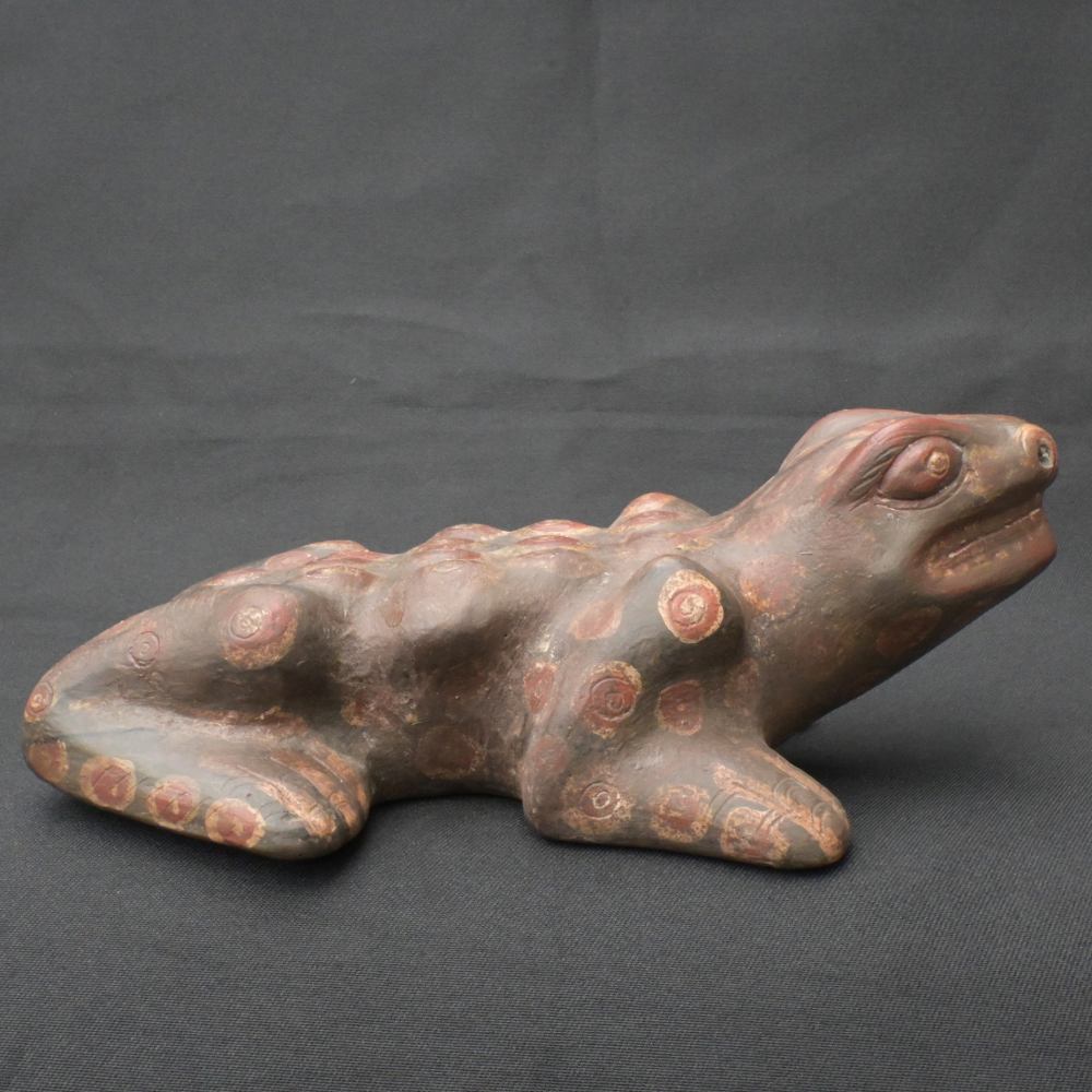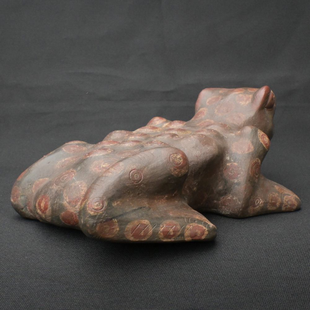 Featuring an elongated frog design, the figurine is adorned with striking hues of cream, reddish tones, and black. Historically, frogs were significant in Tiahuanaco rituals, symbolizing fertility and transformation.