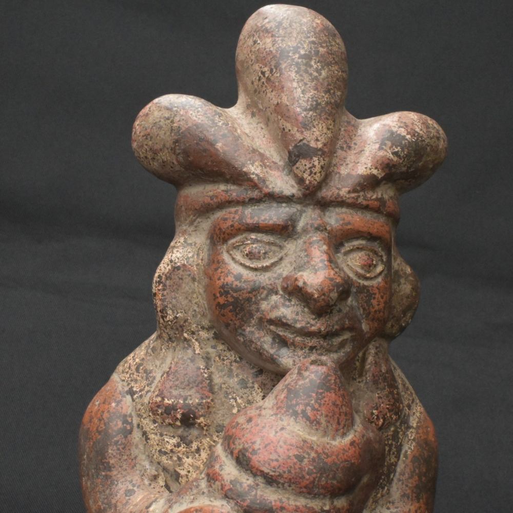 Experience the enigmatic charm of the ancient Moche civilization with this stunning ceramic bottle, masterfully depicting a warrior priest in a ceremonial stance. The figure, clutching a war horn, resonates with the spirit of age-old rituals.