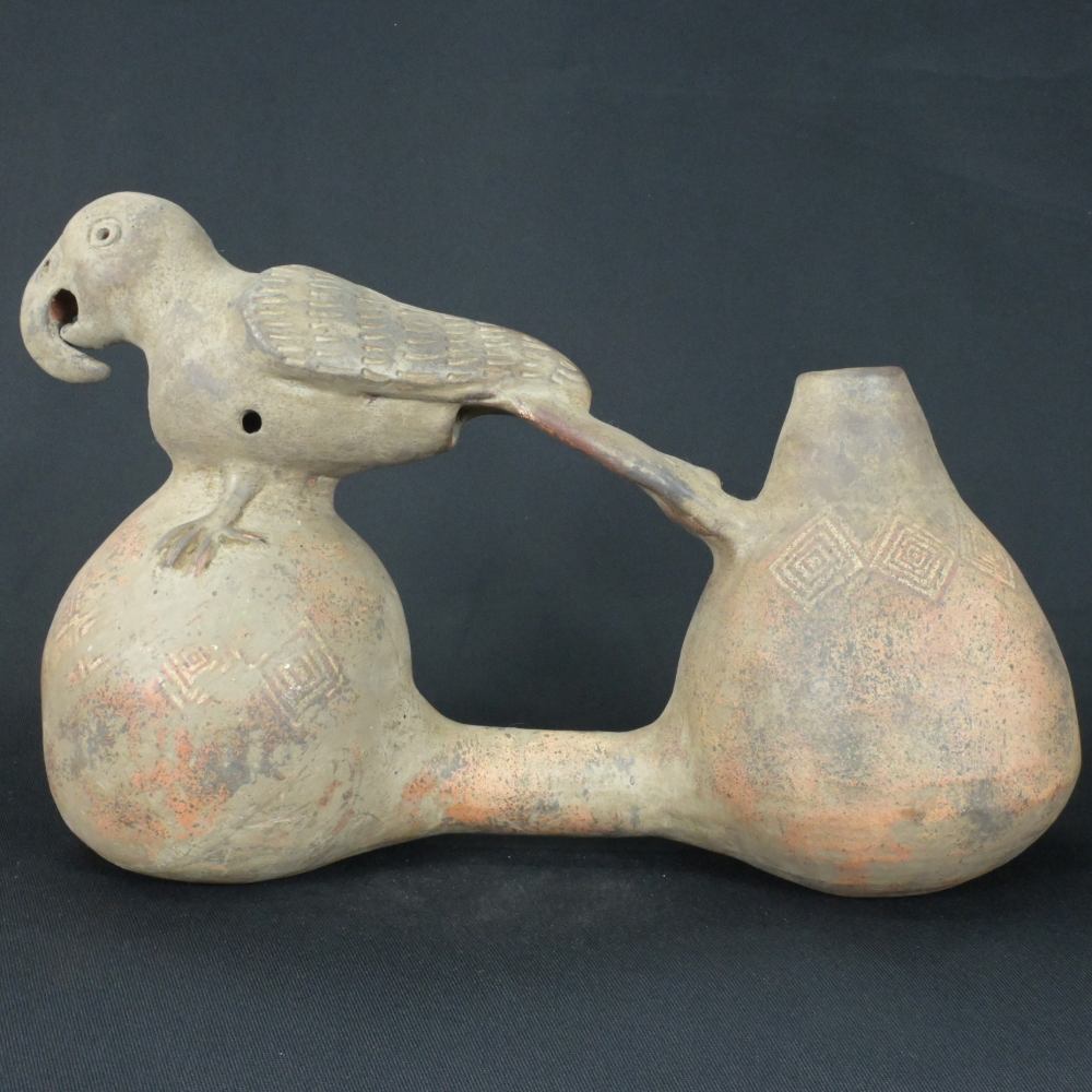 Discover the rich history of the Inca civilization with this exquisite pre-Columbian water whistle. Crafted from ceramic, this piece features a captivating parrot figure perched on top, adorned with earthy tones of orange, black, and white.